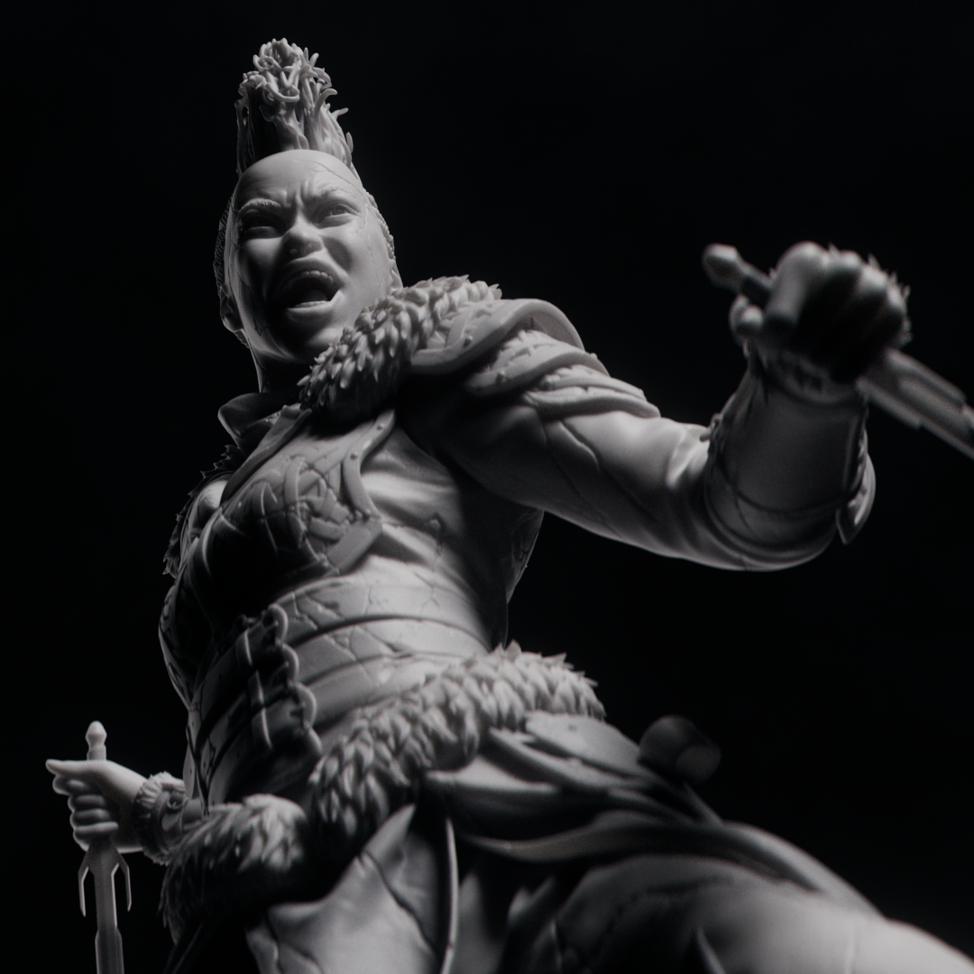 The trailer illustrates the resistance of the heroes (planewalker) to the phyrexian invasion through a large freeze frame battle composition where dazzling white porcelain statues face hordes of creatures covered in phyrexian oil, source of extraterrestrial life, gradually swallowing up any hope of victory. This graphic confrontation ends with the imposing throne of Helesh Norn composed of thousands of statues of soldiers who perished in front of it.